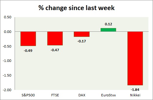 Equities are all mixed in today's trading. Kindly note all instruments mentioned here are CFDs, whose values might differ from cash or future traded. Performance this week at a glance in chart & table -