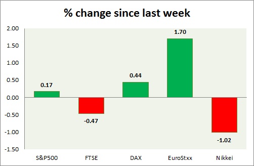 Equities are all green in today's trading. Kindly note all instruments mentioned here are CFDs, whose values might differ from cash or future traded. Performance this week at a glance in chart & table -