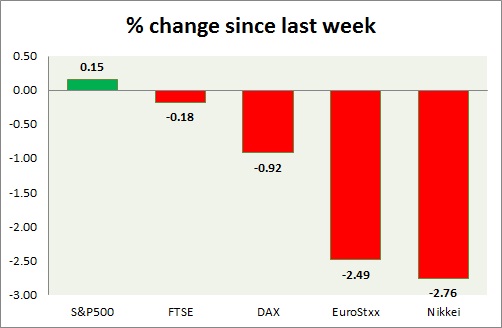 Equities are all red in today’s trading. Kindly note all instruments mentioned here are CFDs, whose values might differ from cash or future traded. Performance this week at a glance in chart & table -