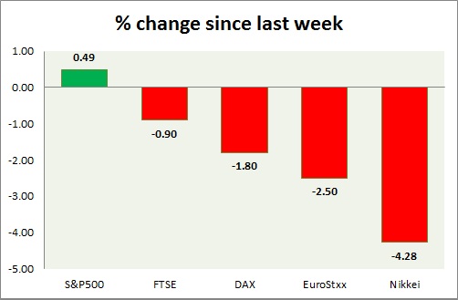 Equities are all down in today’s trading. Kindly note all instruments mentioned here are CFDs, whose values might differ from cash or future traded. Performance this week at a glance in chart & table -