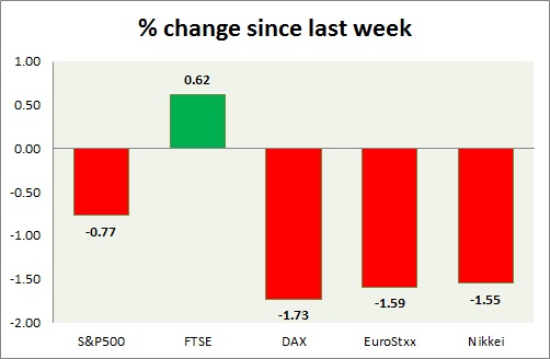 Equities are all green in today’s trading. Kindly note all instruments mentioned here are CFDs, whose values might differ from cash or future traded. Performance this week at a glance in chart & table -