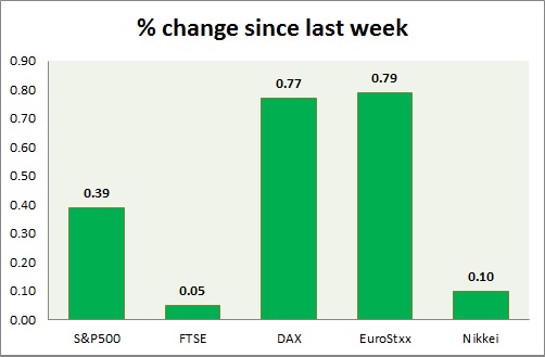 Equities are all green in today’s trading. Kindly note all instruments mentioned here are CFDs, whose values might differ from cash or future traded. Performance this week at a glance in chart & table -