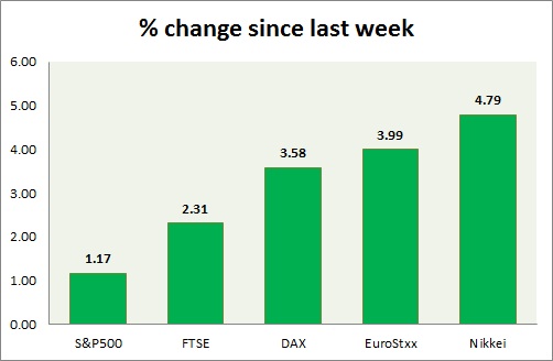 Equities are all green in today’s trading. Kindly note all instruments mentioned here are CFDs, whose values might differ from cash or future traded. Performance this week at a glance in chart & table -