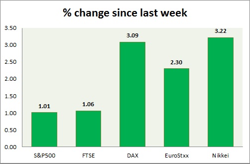 - German DAX is up (+2.1%), France’s CAC40 is up (+1.25%), Italy’s FTSE MIB is up (+0.9%), Spain’s IBEX is up (+1.1%).