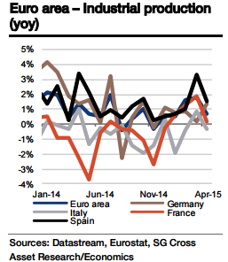 "If materialized, the forecast would imply that the carry-over of industrial output in Q2, assuming a constant profile in June, would be negative at -0.1% qoq, down from +0.9% qoq in Q1. That suggest that GDP growth will not gain strength in Q2 15", says Societe Generale.