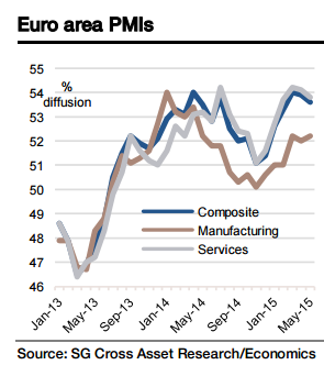 "Our June forecast PMI levels (for both the manufacturing and service sectors) have been consistent with GDP growth of close to 0.4%. Thus our PMI forecasts, if realised, imply 0.4% Q2 15 growth for the euro area - our current growth forecast",says societe Generale.