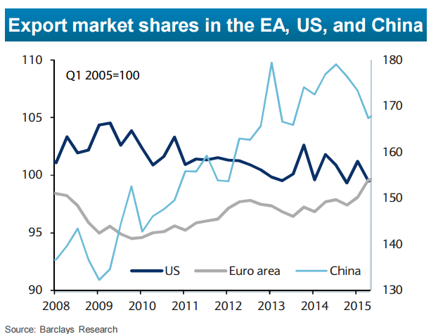 Euro area Q2 GDP growth was in line with the expectations (+0.4% q/q), although stronger exports offset a significant investment contraction and a slowdown in consumption. The strength in exports in H1 15 (5.5% SAAR) was at odds with the weakness of foreign demand (+1.5% SAAR) and probably resulted from the lagged effect of euro depreciation in H2 14 on a real trade-weighted basis, which boosted euro area competitiveness.