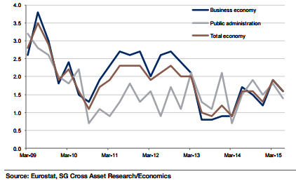 "The ULC growth in Euro area is likely to remain sluggish, falling from 0.8% yoy in Q2 2015 to 0.5% by Q2 2016, at which point it is expected to bottom out and begin to pick up to a slighter faster pace of 0.8-1.0% between 2017 and 2019", says Societe Generale.