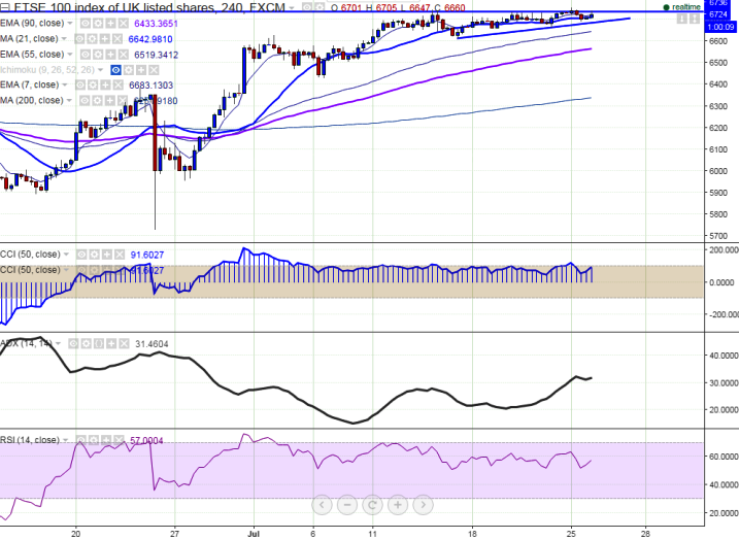 - The index formed a temporary top around 6757 and started to decline from that level. It is currently trading around 6714.