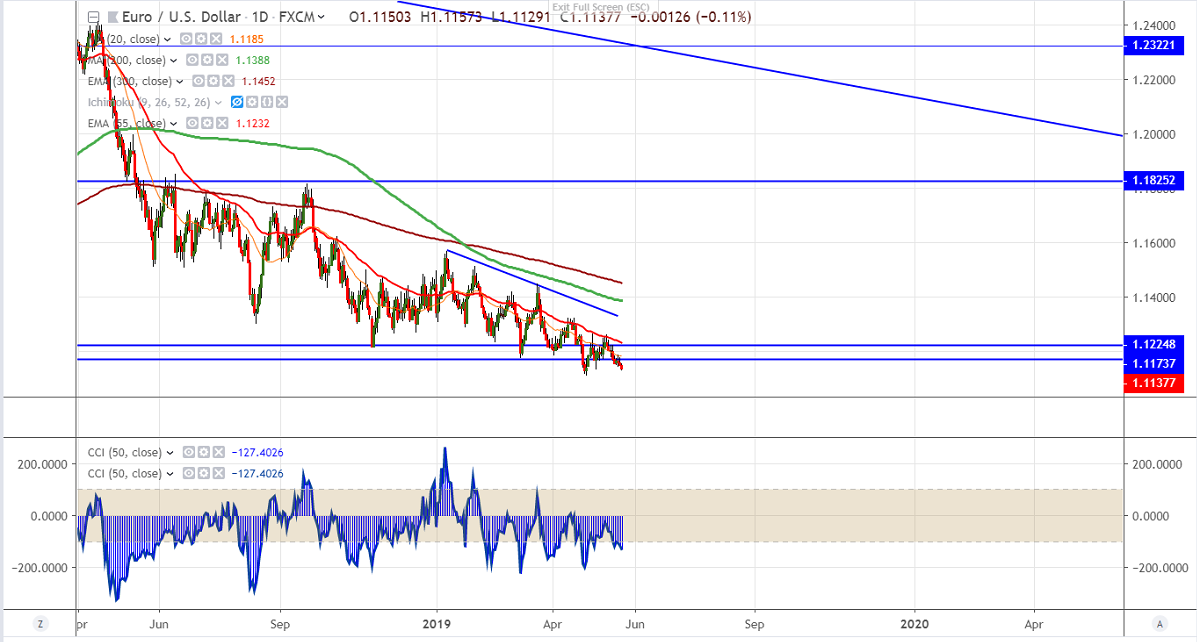 EURUSD hits 4-week low at 1.11291 on account of US-Sino trade tension and Brexit uncertainty.US -China 11th round of talks happened on May 5th in Washington but ended with no trade deal. US imposed further tariffs to Chinese products from 10% to 25%. and to counter this China increased tariff of 5000 US products. In previous week US President blacklisted Chinese telecom major Huawei. So ongoing escalation in trade war is supporting safe haven like US. Fed has clearly mentioned in yesterday minutes that there is no plan for rate cut this year. The Fed’s stance boosts USD.Germany flash PMI services and manufacturing data came slightly weaker than expected. European parliament elections voting starts today and results will be published on Sunday.Any chance of Populist coming to power will have negative impact on Euro.It is currently trading around 1.11369.