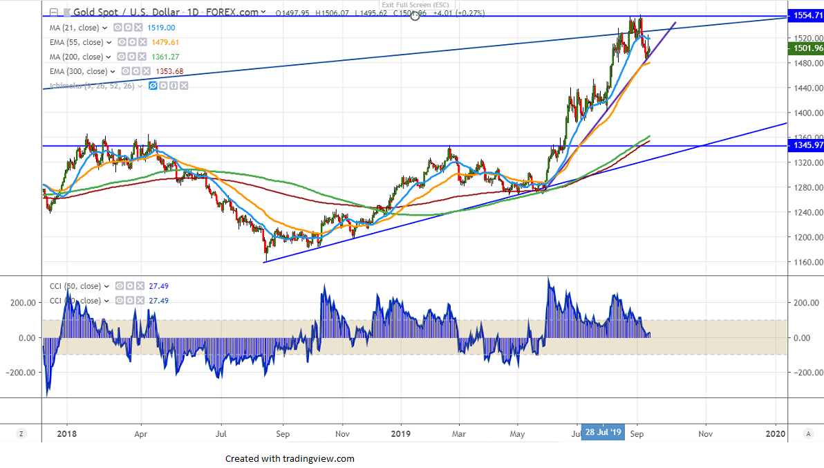 Gold has shown a good recovery of more than $20 after ECB monetary policy. The central bank has cut its deposit rate by 10 bps to -0.50% and starts a new stimulus program of 20 bn euros bond purchase. The yellow metal hits high of $1524 and started to decline sharply on positive comments by Trump US-China trade talks. It is currently trading around $1499.