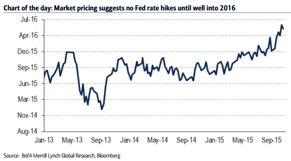 "There are two potential paths the Fed can go down at the October meeting: start to signal that they are capitulating on rate hikes this year, or remain cautious optimistic for liftoff in December. How they characterize the recent data and the global and financial risks will be the most likely signs of which path they are leaning towards", states BofAML.
