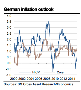 "We expect German HICP inflation to average 0.5% in 2015 and 1.7% in 2016, while the core metric should remain stable at 1.2% in 2015 and 1.4% in 2016", says Societe Generale.