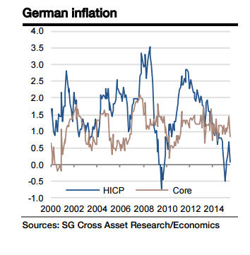 "We expect German HICP inflation to average 0.4% in 2015 and 1.7% in 2016, while the core metric should remain stable at 1.2% in 2015 and 1.4% in 2016," said Societe Generale in a report on Monday.