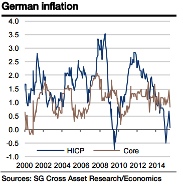 "Looking ahead, German HICP inflation to average 0.4% in 2015 and 1.7% in 2016, while the core metric should remain stable at 1.2% in 2015 and 1.4% in 2016", says Societe Generale.