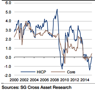 "Looking ahead, Spanish HICP inflation should remain in negative territory until the end of the summer, averaging -0.3% for 2015 and 1.3% in 2016. The core metric should be 0.2% in 2015 before rising to 0.8% in 2016", says Societe Generale.