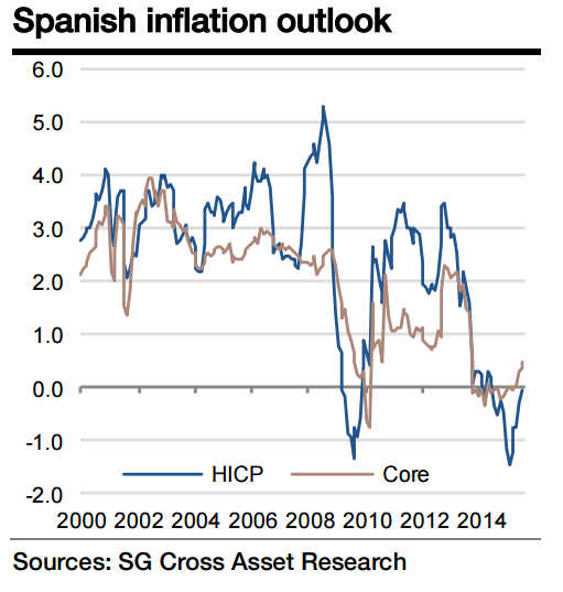 Looking ahead, Spanish HICP inflation should average -0.7% for 2015 and 0.6% in 2016. The core metric should be 0.2% in 2015 before rising to 0.9% in 2016.