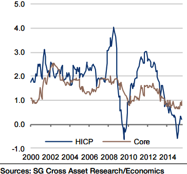 "Looking ahead, euro area HICP inflation is expected to average 0.1% in 2015 and 1.0% in 2016, while the core metric should average 0.8% in 2015 and 1.2% in 2016", added Societe Generale.