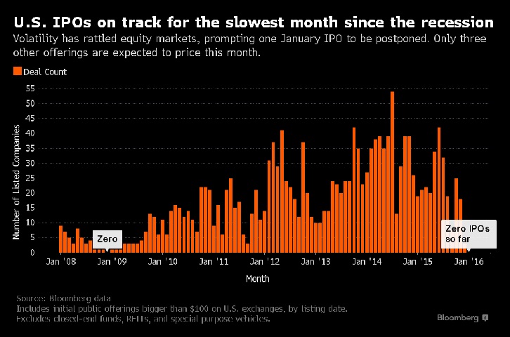 However, market turmoil is leading to a bone dry scenario for IPO market. We are almost at the end of first month and number of IPOs launched is zero, which is for the first time since December 2008, according to a report by Bloomberg. According to Bloomberg data, number of IPOs launched in 2015 January have been 19 and in 2014, number of IPOs launched in January were 54. So far there has been only one IPO, planned for January, which got delayed.