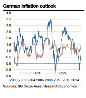 "We expect the prices paid for services to fall back a bit in June after their big jump in May which should also keep a lid on the headline figure. Looking ahead, we expect German HICP inflation to average 0.5% in 2015 and 1.7% in 2016, while the core metric should remain stable at 1.2% in 2015 and 1.4% in 2016",says Societe Generale.