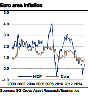 "Looking ahead, Euro area HICP inflation is expected to average 0.3% in 2015 and 1.5% in 2016, while the core metric should remain stable at 0.9% in 2015 and 1.1% in 2016", added Societe Generale.