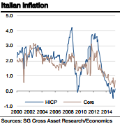 "Italian HICP inflation is set to print at 0.3% yoy in June, one tick higher than in May". Looking ahead, Italian HICP inflation is expected to average 0.6% in 2015 and 1.5% yoy in 2016. The core component should average 1.1% in 2015 and 1.3% in 2016", says Societe Generale.
