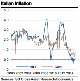 "Looking ahead, Italian HICP inflation is expected to average 0.6% in 2015 and 1.5% yoy in 2016. The core component should average 1.1% in 2015 and 1.3% in 2016", added Societe Generale.