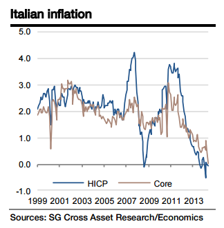 "We expect Italian HICP inflation to average 0.4% in 2015 and 1.6% yoy in 2016. The core component should average 0.7% in 2015 and 1.1% in 2016",says Societe Generale.