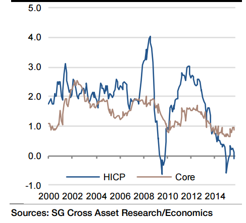 "We expect euro area HICP inflation to average 0.1% in 2015 and 1.0% in 2016, while the core metric should average 0.8% in 2015 and 1.2% in 2016", says Societe Generale.