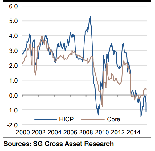 "We expect the core metric to be 0.2% in 2015 before rising to 0.9% in 2016", says Societe Generale.