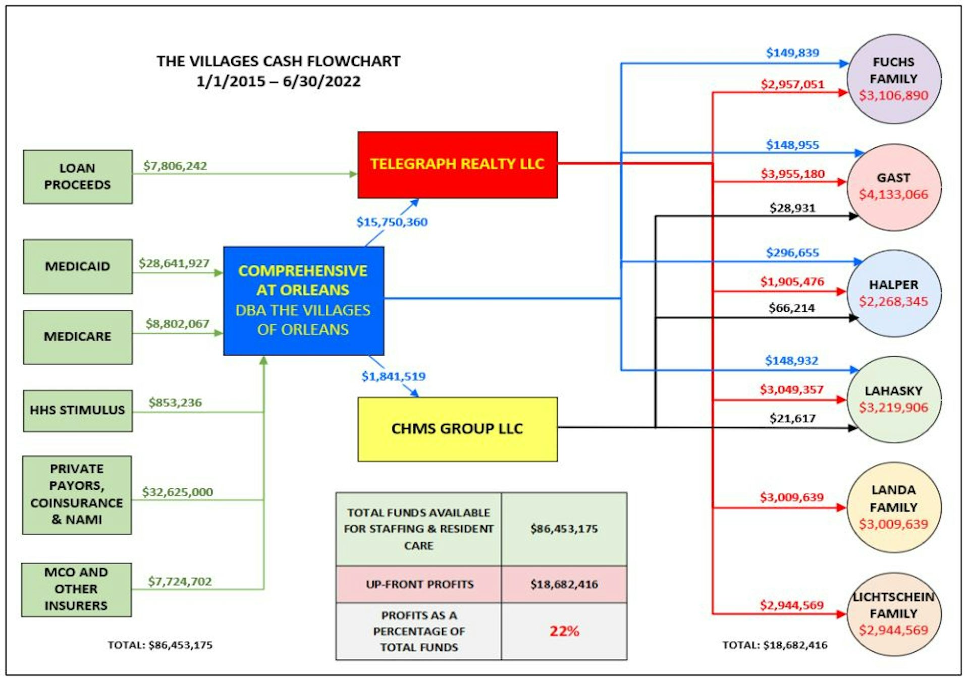 Meanwhile, according to a 2022 lawsuit filed by the New York attorney general, riches were siphoned out of the nursing home and into the pockets of the official owner, Bernard Fuchs, as well as assorted friends, business associates and family. The lawsuit says $18.7 million flowed from the facility to entities owned by a group of men who controlled the Village’s operations.