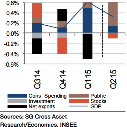 "French GDP growth to come in at 0.3% qoq in Q2, following a relatively strong 0.6% qoq in Q1", says Societe Generale.