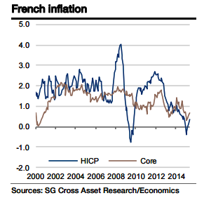 "Looking ahead, French HICP inflation is expected to average 0.4% in 2015 and 1.4% in 2016, while the core metric should average 0.7% in 2015 and 1.1% in 2016", says Societe Generale.