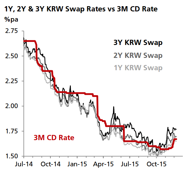 Frontend KRW swap rates are now trading above the 3M CD rate (which serves as the floating leg fixing for KRW swaps). This marks a change from 3Q when the market was speculating on further easing by the Bank of Korea (BoK). However, increases in KRW market rates are likely to be modest in the coming quarters. The pace of Fed hikes and the state of the Korean economy are critical to gauge the trajectory of KRW rates.