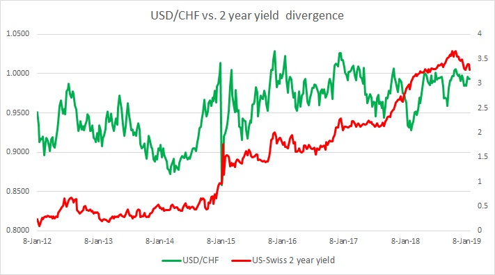 - In our January review, we noted that the spread has widened further by 30 bps to 292 bps in favor of the dollar, but the franc has strengthened by more than 550 pips that have led to increasing divergence.