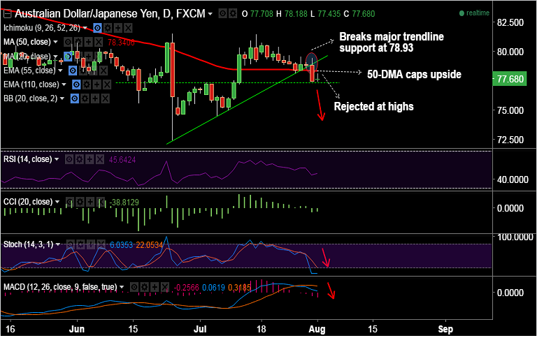 - The pair has broken major trendline support at 78.93, and has slipped below 50-DMA at 78.34.