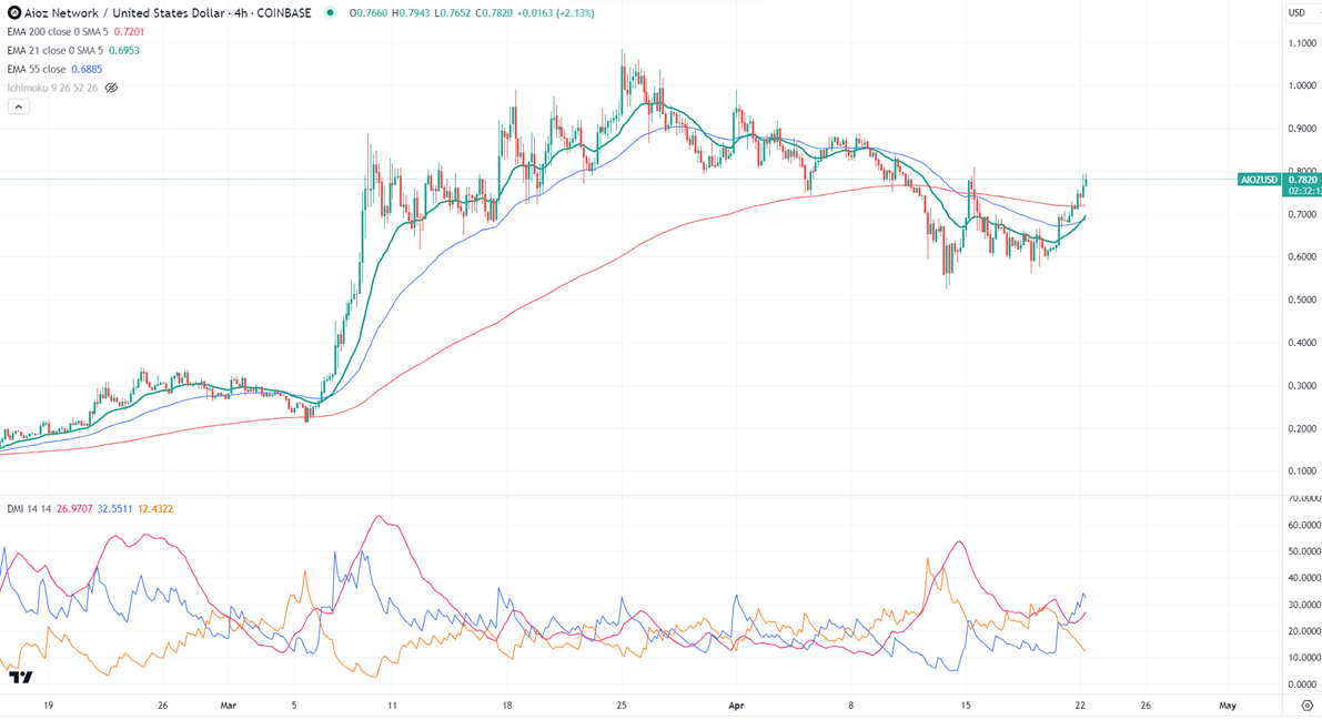 AIOZUSD has gained more than 40% in the past three days. The pair holds above the short-term (21 and 55 EMA) and long-term moving average in the 4-hour chart. It hit a high of $0.7940 and is currently trading around $0.7801.