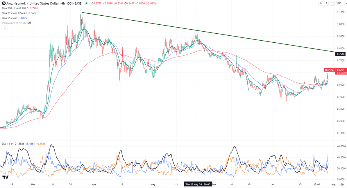 AIOZUSD has gained more than 90% in the past three weeks. The pair holds above the short-term (21 and 55 EMA) and long-term moving average in the 4-hour chart. It hit a high of $0.6896 and is currently trading around $0.6274.