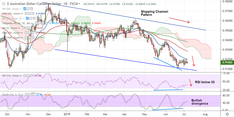 Major trend in the pair is bearish, the pair grinds lower in 'Slopping Channel' pattern.