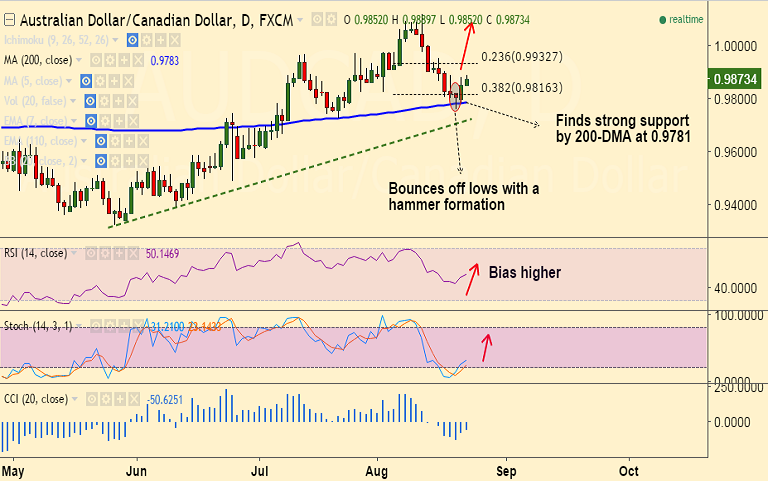 - AUD/CAD has held major support by 200-DMA at 0.9781 and edged higher on the day.