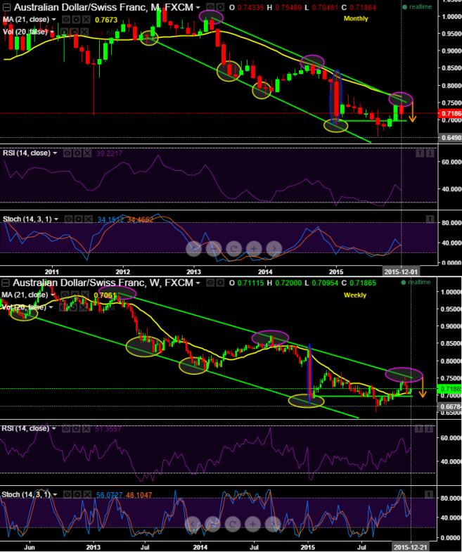 AUDCHF bearish swings have been a slant decline, it forms downward channel with a distance of around 1700 pips (see blue circled area where a big bearish candle with big real body measures the distance of the channel almost accurately).
