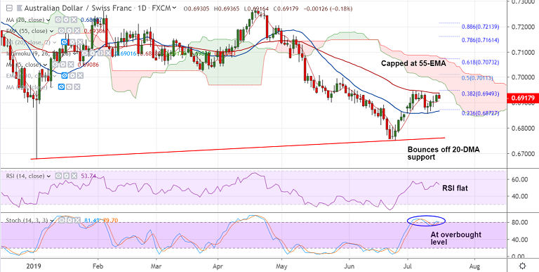 Rejection at 55-EMA can see retrace till 20-DMA at 0.6868. Break below 20-DMA negates near-term bullishness.