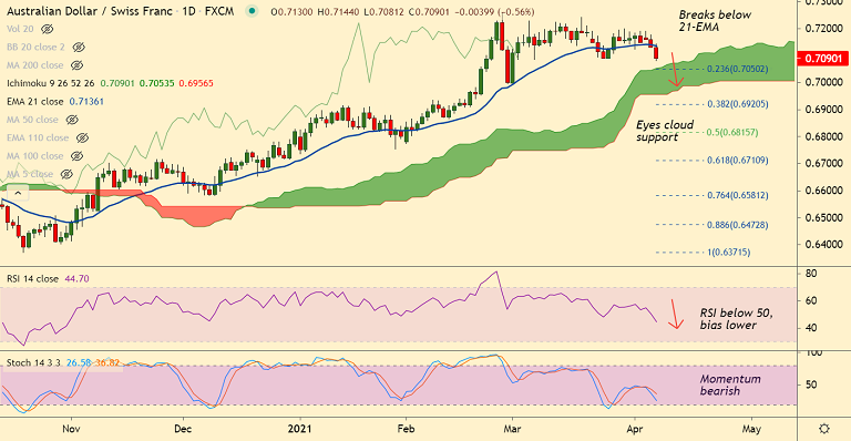 Price action has slipped below 21-EMA which caps upside at 0.7135, 5-DMA is now biased lower.
