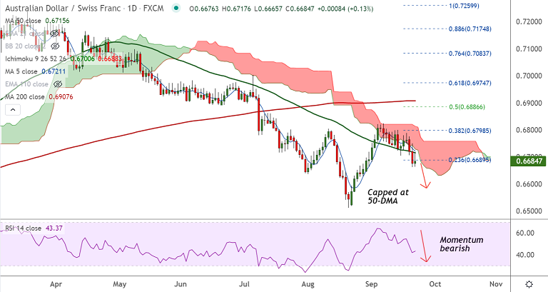 - Upside in the pair was rejected at stiff resistance at 50-DMA at 0.6715