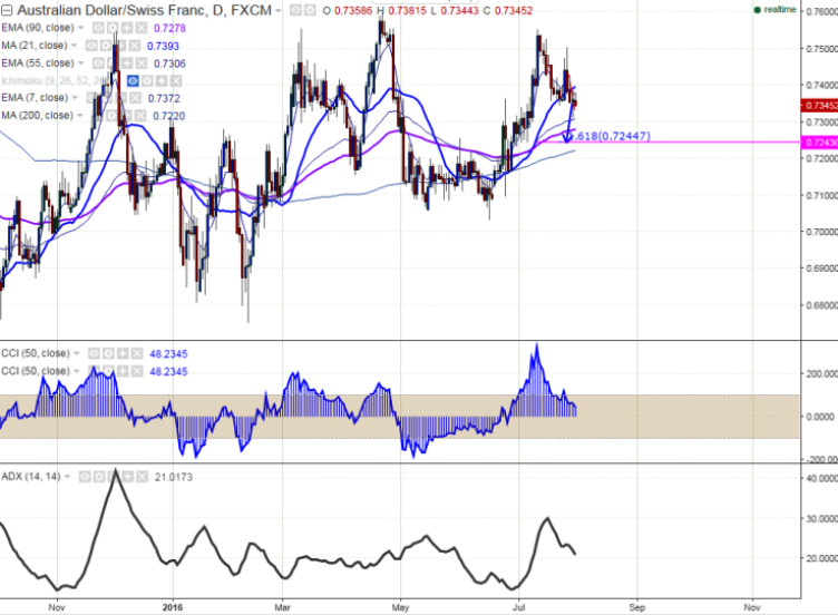 - AUD/CHF has declined till 0.7310 and jumped from that level. It has taken support near 55 day EMA and recovered till 0.73815 at the time of writing.