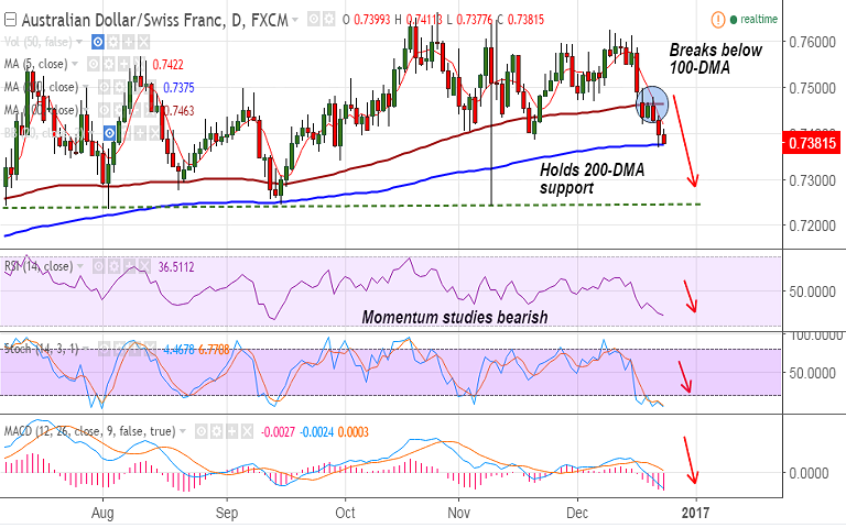 - AUD/CHF extends downside after breaking below major trendline support at 0.7460 and 100-DMA at 0.7464.