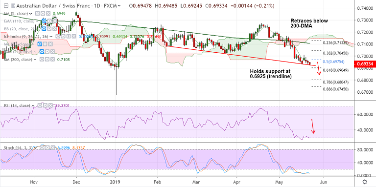 AUD/CHF trades 0.21% lower on the day at 0.6933 at 06:45 GMT, bias bearish.