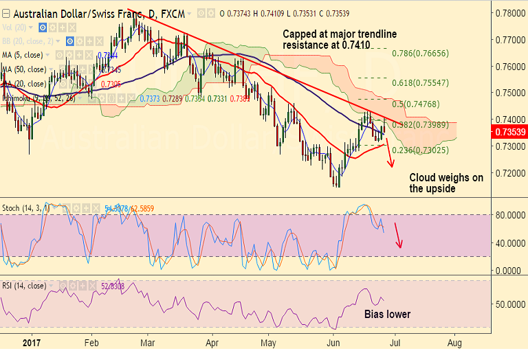 - AUD/CHF upside was rejected at major trendline resistance at 0.7410.