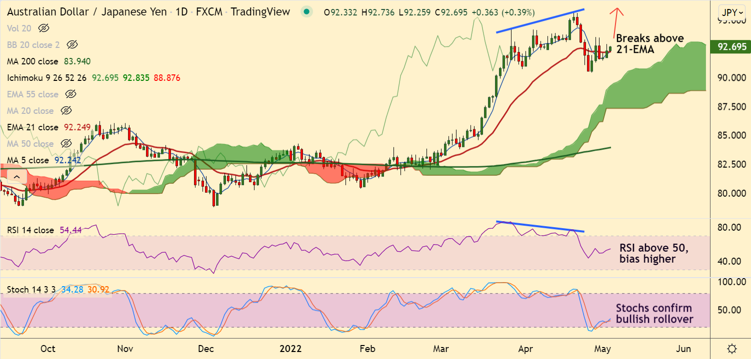 AUD/JPY was trading 0.40% higher on the day at 92.71 at around 12:00 GMT. The pair has broken above 21-EMA raising scope for further upside.