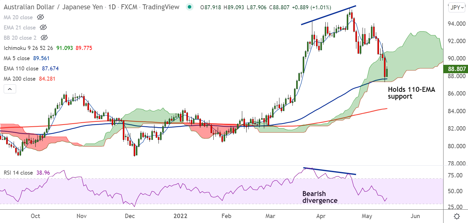Summary: AUD/JPY pivotal at 110-EMA support, break below will see more weakness.